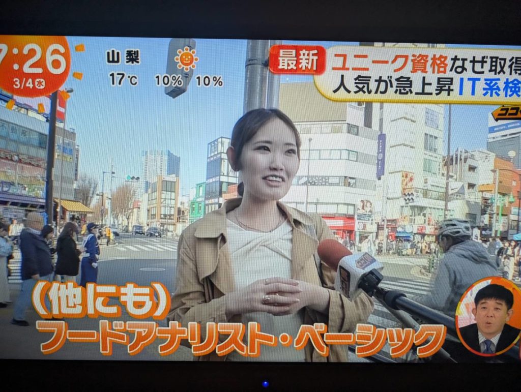 「めざましテレビ」(フジテレビ系)の「ユニーク検定なぜ取得人気が急上昇」特集で、フードアナリスト・ベーシック検定が紹介されました。 2026年3月4日 メディア掲載実績 メディア掲載実績 2026年 by foodanalyst_wp. 2026年3月4日(水)「めざましテレビ」(フジテレビ系) 「ユニーク検定なぜ取得人気が急上昇」特集で、フードアナリスト・ベーシック検定が紹介されました。 前の記事 次の記事