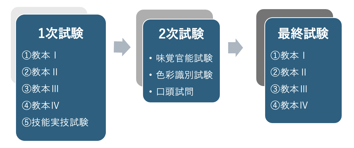 - 最終試験は、2次試験3課目(味覚官能試験、色彩識別試験、口頭試問)すべてに合格された方が受験できます。