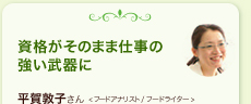 以前からフードライターとして活動していましたが、「もっと話に広がりを持たせたい」「体系的な知識を身につけたい」と思い、この資格を取得しました。取材先では食の専門家として認められるようになり、商品企画という、これまでの枠を超えた仕事も経験するようになりました。そして何よりもこの資格を通じて自分の食生活がより楽しくなりました!